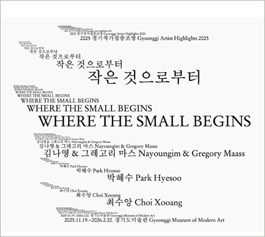 경기도미술관은 2025 경기작가집중조명 《작은 것으로부터》를 개최합니다. 올해로 4회를 맞이하는 경기작가집중조명은 경기도를 기반으로 활동하는 중견 작가들의 작품세계를 심층 조명하고자 경기문화재단 예술본부와 협력하여 마련된 기획전입니다. 이번 전시 《작은 것으로부터》는 신작과 더불어 김나영 & 그레고리 마스, 박혜수, 최수앙의 작업 28점을 선보입니다.