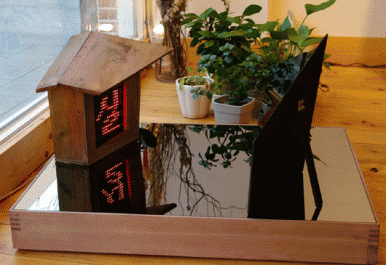 Nr.2_송신자(워크룸디자인 실외전경, 디테일)(부분), 1 음절 RG LED 싸인패널 1개, 투명 판유리, 거울, 금속 플렉시블 호스, 나무에 채색, 41x41x55cm, 2009