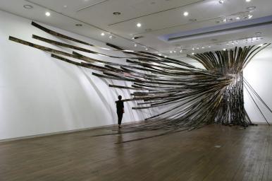 뒤엉켜진, 패널에 석분에 안료, 시멘트, 나무에 먹과 염료, 흑색 도장 유리, 종이 테이프, 100 X 80cm, 2010