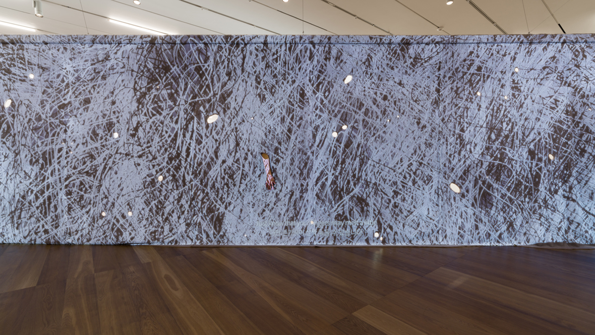 <반으로 잘린 여인> 2025 린넨을 덮은 목재 위에 광물 분말층과 옻칠, 돼지 가죽과 장어 가죽, 린넨 피복 좌대, 혼합 재료 72.4x70.5x97.2cm, 152.4x77.5x55.8cm, <배경막> 2025 투명 접착 필름 위 UV 프린트, 반투명 처리 384×216cm