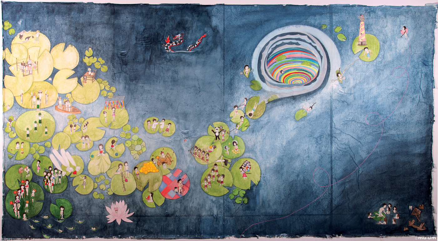 Waterlilies Gliding Parachutes, Watercolor, gouache, pencil on rice paper on canvas, 151.1x274.3cm, 2012, Courtesy the artist and Kukje Gallery
