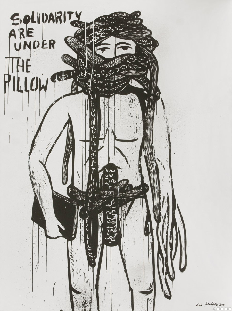 단결은 배게 맡에(Solidarity is under the pillow), 캔버스에 아크릴, 잉크, 크링크 마커, 200x150cm, 2012