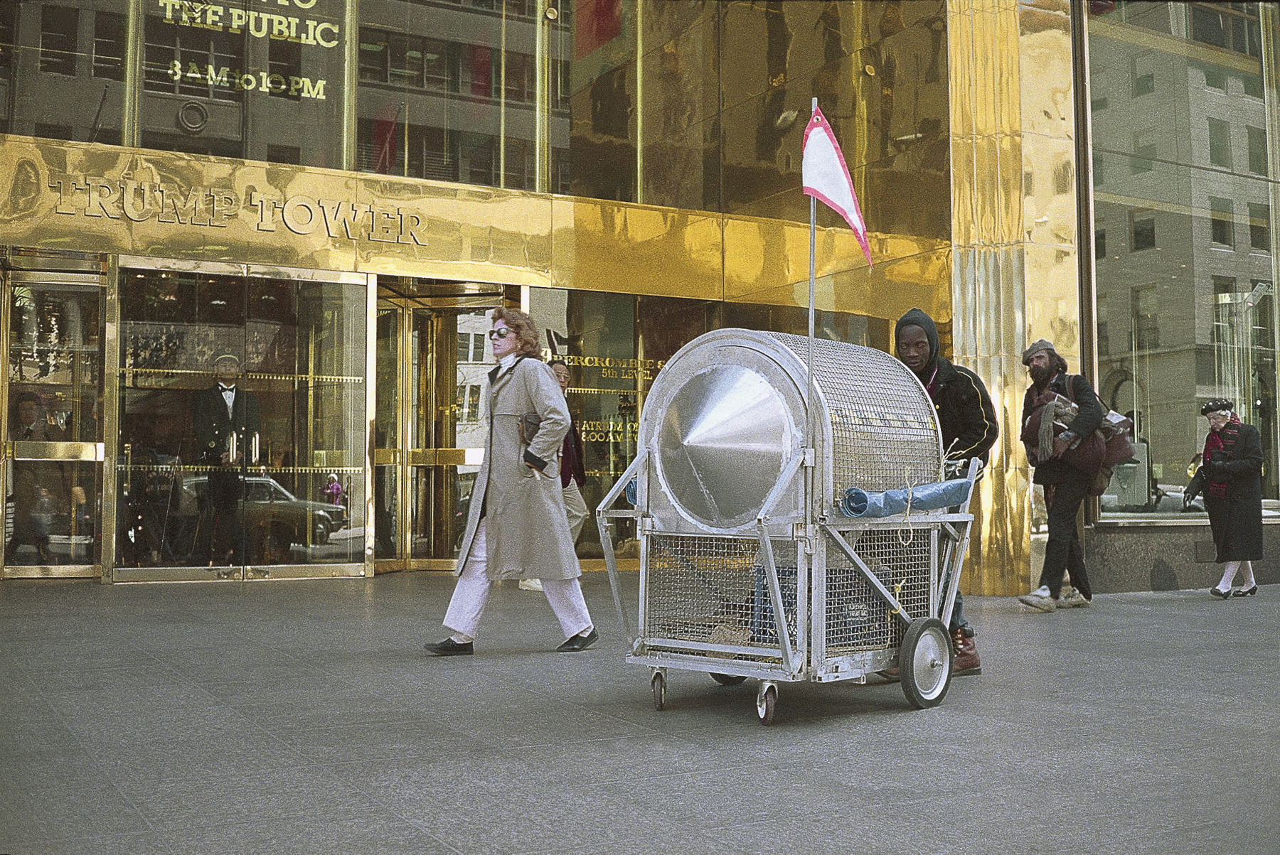 뉴욕 트럼프 타워 앞에서 한 노숙인이 <노숙자 수레>(1988년 작)을 시연 중인 모습