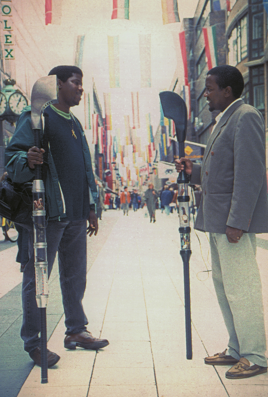 스톡홀름 거리에서 <외국인 지팡이>(1993년 작)을 시연 중인 두 명의 퍼포머 들, 1994, 바르셀로나 현대미술관 소장