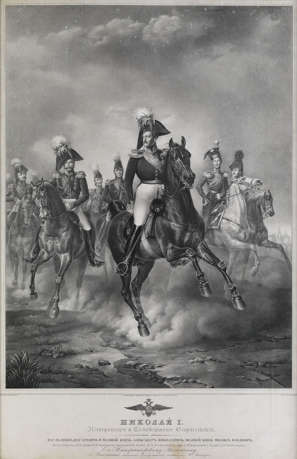 Tsar Nikolas I. zu Pferd mit Begleitern. Lithographie after Franz Krüger. Circa 87 x 54 cm. XIX с.,
