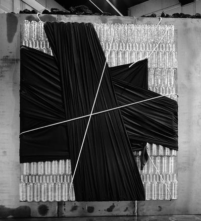 2010 steel panels, glass bottles, fabric, wire and hooks 200 x 180 cm