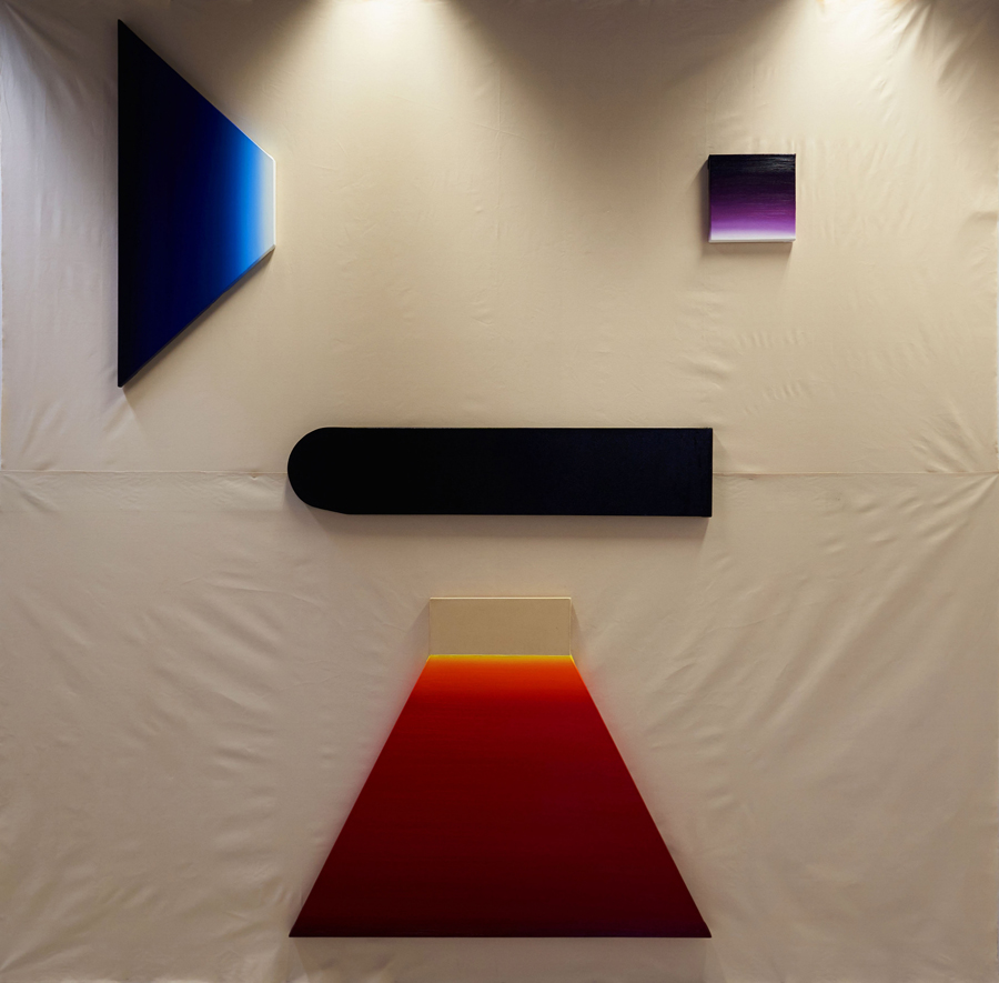 청, 자, 흑 과 홍 안에 구성 Composition in blue, purple, black and red, oil on canvas and cotton duck canvas fabric, 2019