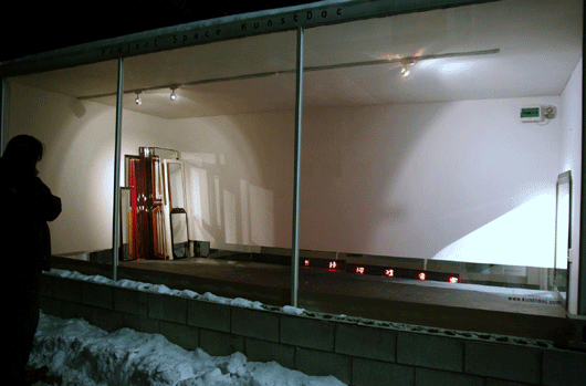 Nr.1_탈-코드화 된 빛(쿤스트독 프로젝트 스페이스), 1음절 RG LED 싸인패널 6개, 오브제(거울) 설치, 580x280x225cm, 2009