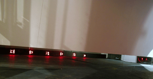 Nr.1_탈-코드화 된 빛(쿤스트독 프로젝트 스페이스), 1음절 RG LED 싸인패널 6개, 오브제(거울) 설치, 580x280x225cm, 2009