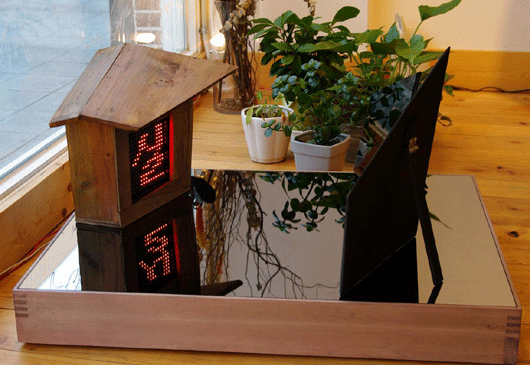 Nr.2_송신자(워크룸디자인 실외전경, 디테일), 1 음절 RG LED 싸인패널 1개, 투명 판유리, 거울, 금속 플렉시블 호스, 나무에 채색, 41x41x55cm, 2009