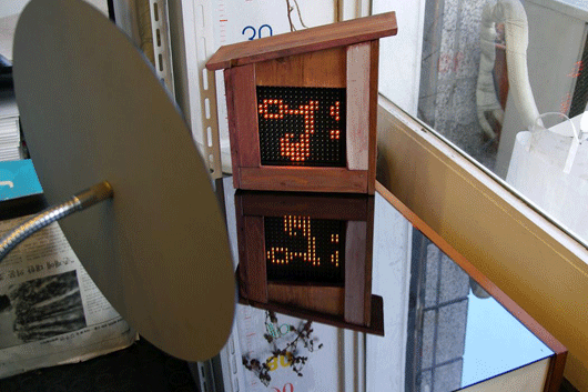 Nr.2_송신자(워크룸디자인 실외전경, 디테일)(부분), 1 음절 RG LED 싸인패널 1개, 투명 판유리, 거울, 금속 플렉시블 호스, 나무에 채색, 41x41x55cm, 2009