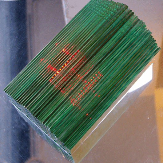 Nr.1_탈-코드화 된 빛(쿤스트독 프로젝트 스페이스)(부분), 1 음절 RG LED 싸인패널 6개, 오브제(거울) 설치, 580x280x225cm, 2009