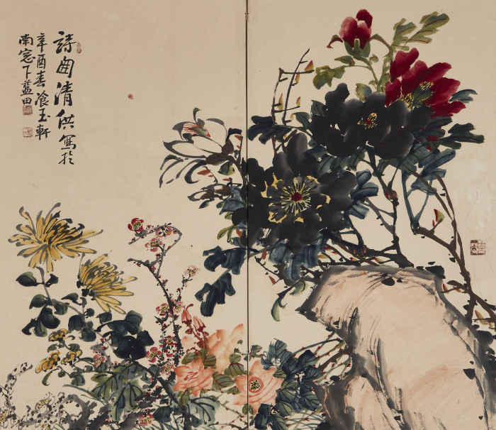 군방도-시창청공, 1981, 종이에 먹, 색; 2폭 병풍, 116.3 × 103 cm, 개인소장