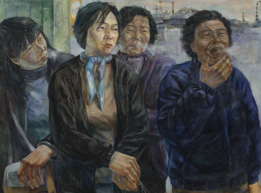 아침 버스를 기다리는 구로공단의 여성들, 1991, 85x115 cm, oil on canvas