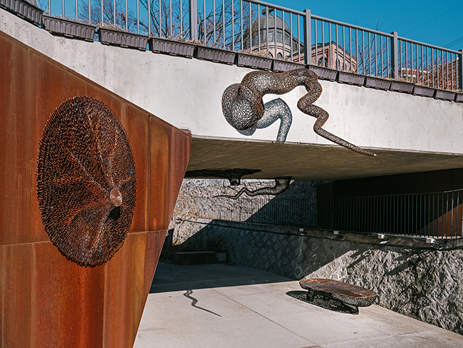 생이 깃든 소나무, 025년_동파이프 산소용접_650(h)x105x113cm, 돌 4점 포함(개별 사이즈)