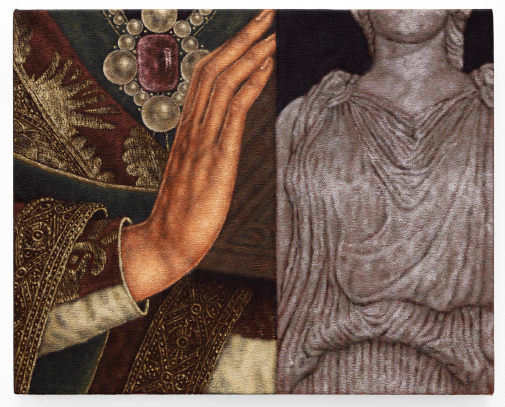 (최선을 다해 뻗은) 손과 카리아티드, 2025, 캔버스에 유화, 41×51cm. 이미지 ⓒ 제니퍼 칼바료 2025, 실린더 제공