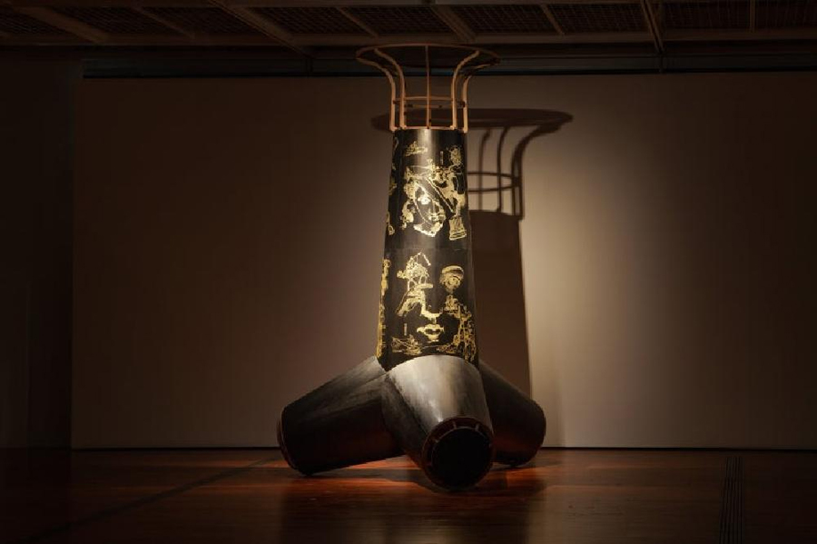겹쳐진 기념비, 2026, 합판에 먹, 유채, 스텐실, 1채널 사운드 루프 (목소리 Andrzej Jaświłek), 260×340×270cm, 작가소장