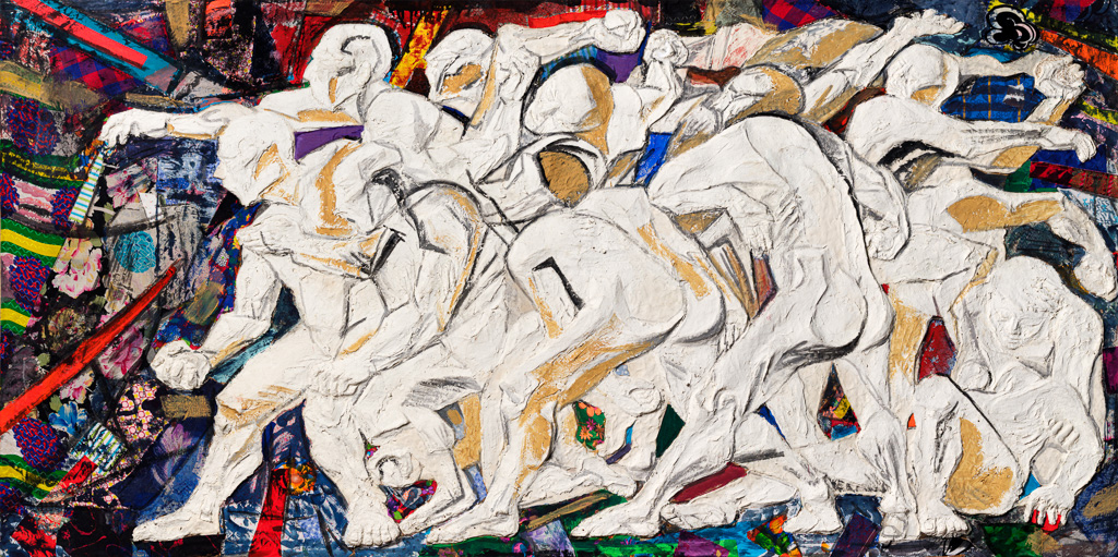 군상, 1986, 122×244cm, 패널에 종이부조, 천, 색채