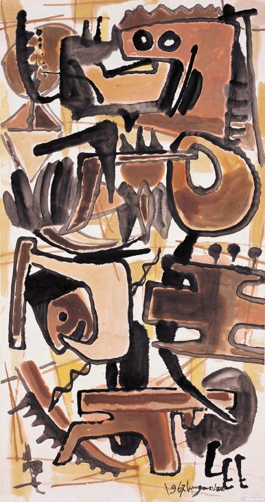 구성, 한지에 수묵채색, 128x66cm, 1967, 이응노미술관