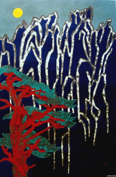 산, 소나무, 달, 한지, 먹, 천연혼합채색, 175x112cm, 2012, Paris Selective Gallery