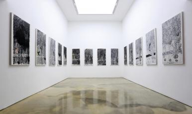 Fountain, 2023, Black ink, white powder, tempera and gouache on Korean paper mounted on wood, 258 x 206 cm