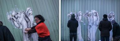 난민들과 드로잉을 그리는 작가, 프랑스 칼레, 2014