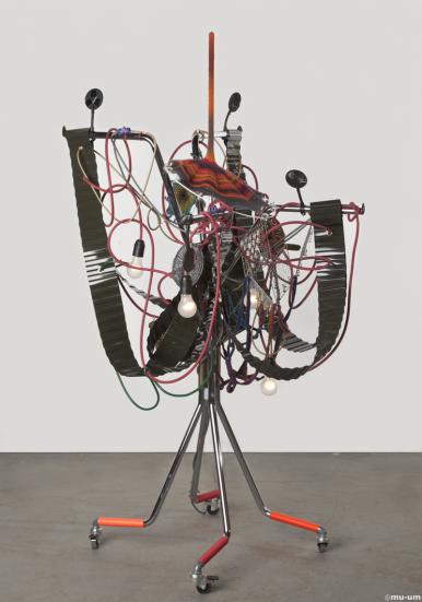 흐르는 시간대, 행거, 전구, 전선, 금속 링, 거울, 털실, PVC 루핑 (진녹색), 금속 격자, 자전거용 백미러, 끈 (적색, 주황색), 거울, 괴목, 옷핀, 180x127x125cm, 2011