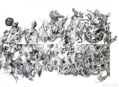 동문서답, Indian ink, soldering iron, coating on Korean paper, 170x132cm, 2009