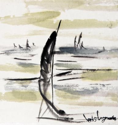 물이있는 풍경, 한지에 수묵담채, 34x33cm, 1985, 이응노미술관