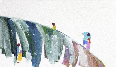 우연히 이렇게 넷이 모였고 술도 마셨다, 2017, 천 위에 아크릴릭 과슈, 젯소, 210x210cm